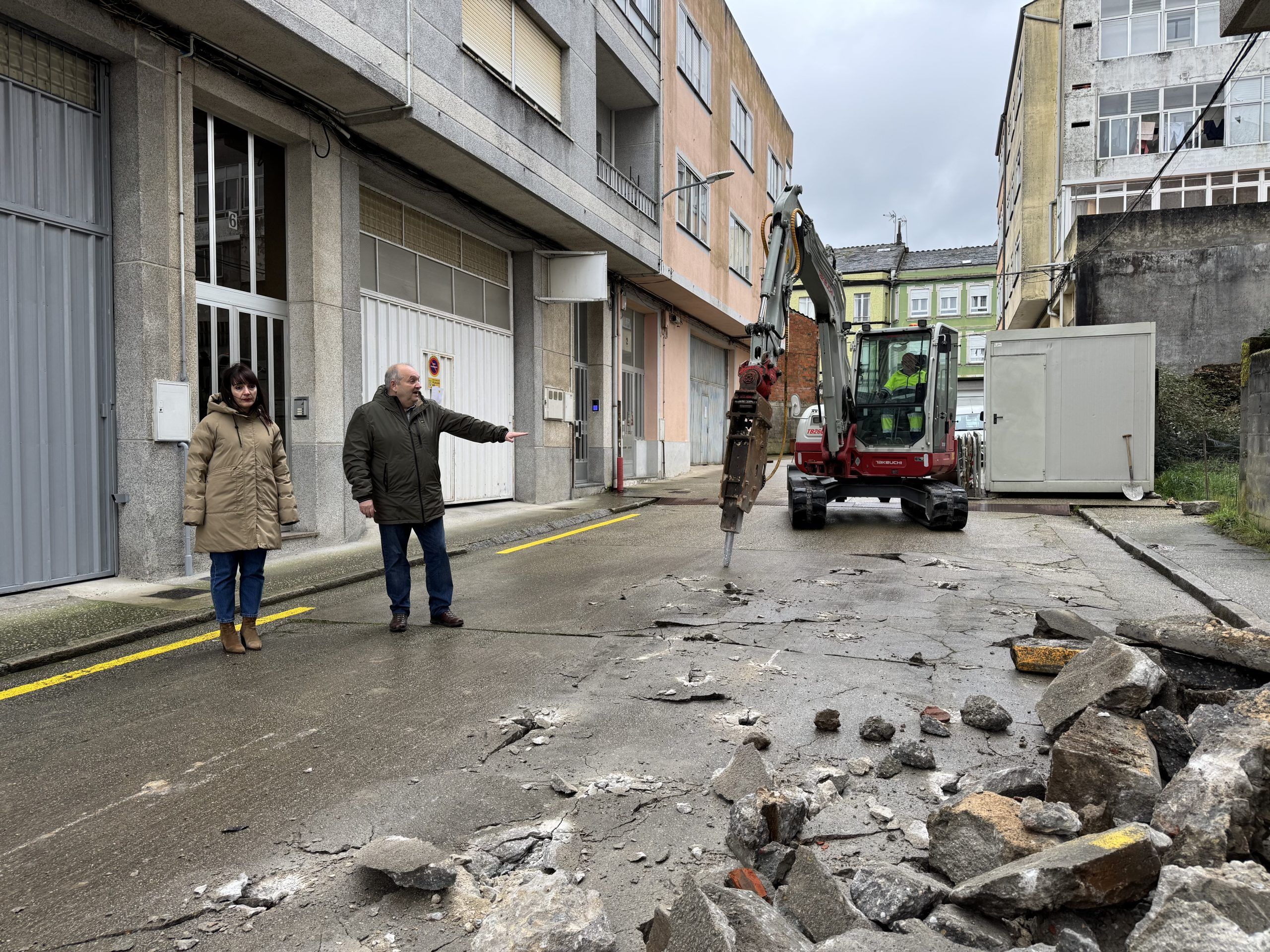A alcaldesa de Vilalba, Marta Rouco, e o concelleiro de Infraestruturas Urbanas, Luis Fernández, desprazáronse esta mañá ata a zona para supervisar o comezo dos traballos, que arrancaron coa demolición do firme existente, unha fase previa necesaria para acometer o conxunto da intervención prevista.
